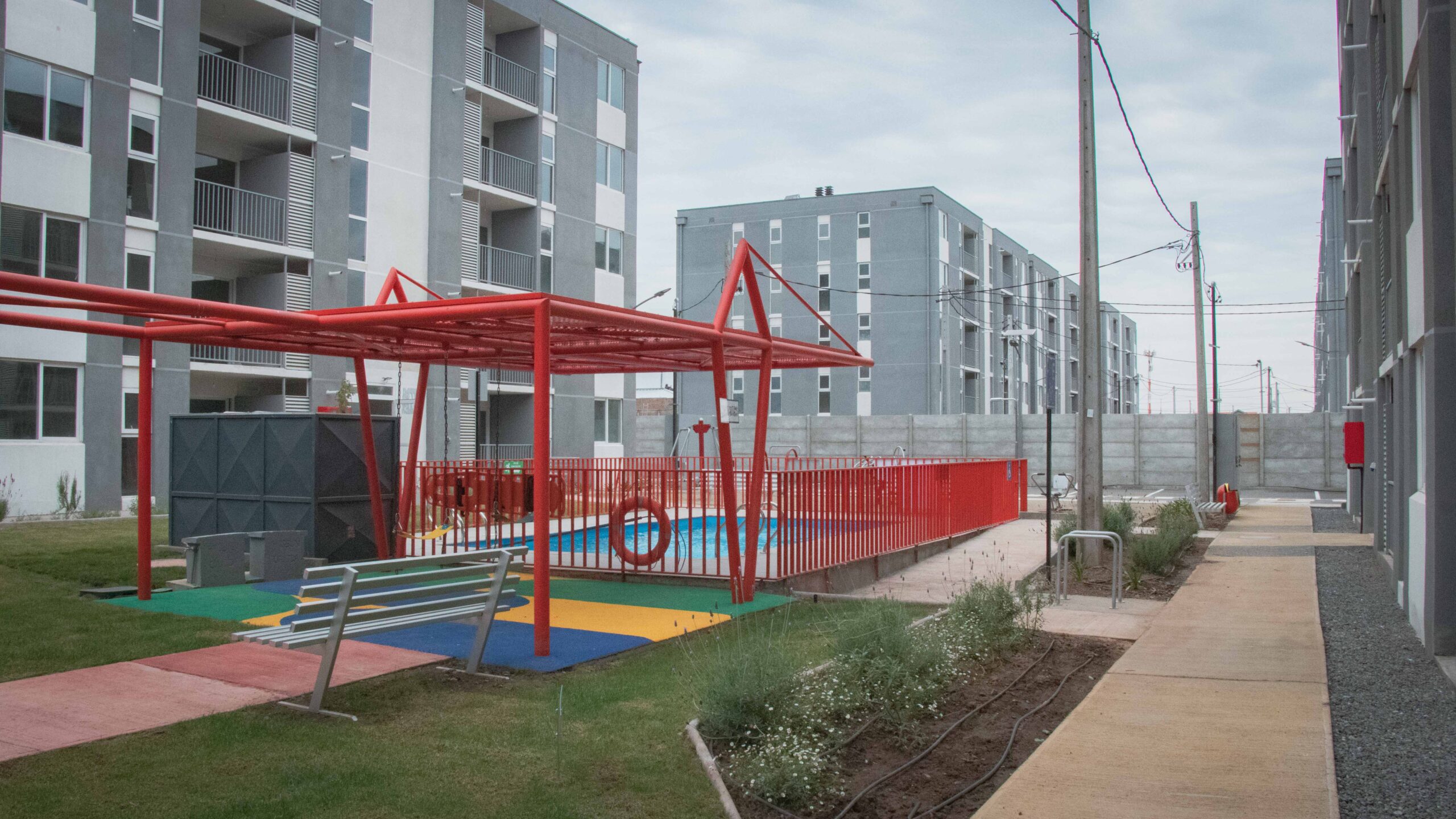 La primera etapa del master plan contempla siete edificios de cinco pisos, con áreas comunes que fomentan la convivencia y el uso compartido del espacio. Entre sus instalaciones se cuentan piscina, quinchos, sala multiuso, zonas de juegos y ejercicios, control de acceso con portería y un strip center con 14 locales comerciales.
