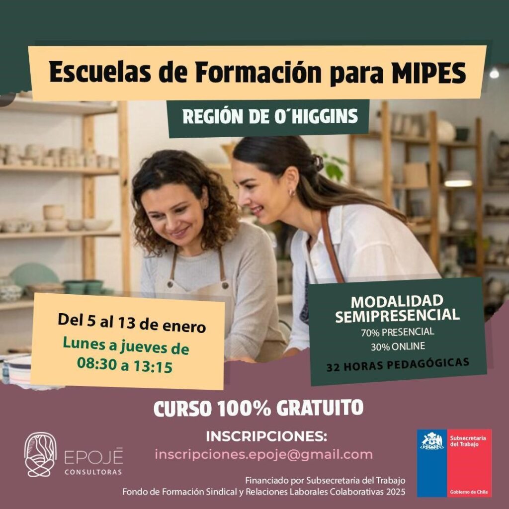 El Ministerio del Trabajo y Previsión Social, invita a dueños/as y trabajadores/as de emprendimientos interesados/as en fortalecer sus conocimientos y herramientas para impulsar sus negocios, a ser parte del proyecto gratuito Escuelas de Formación para MIPES 2025, desarrollado por Epojé Consultoras en la región de O’Higgins.