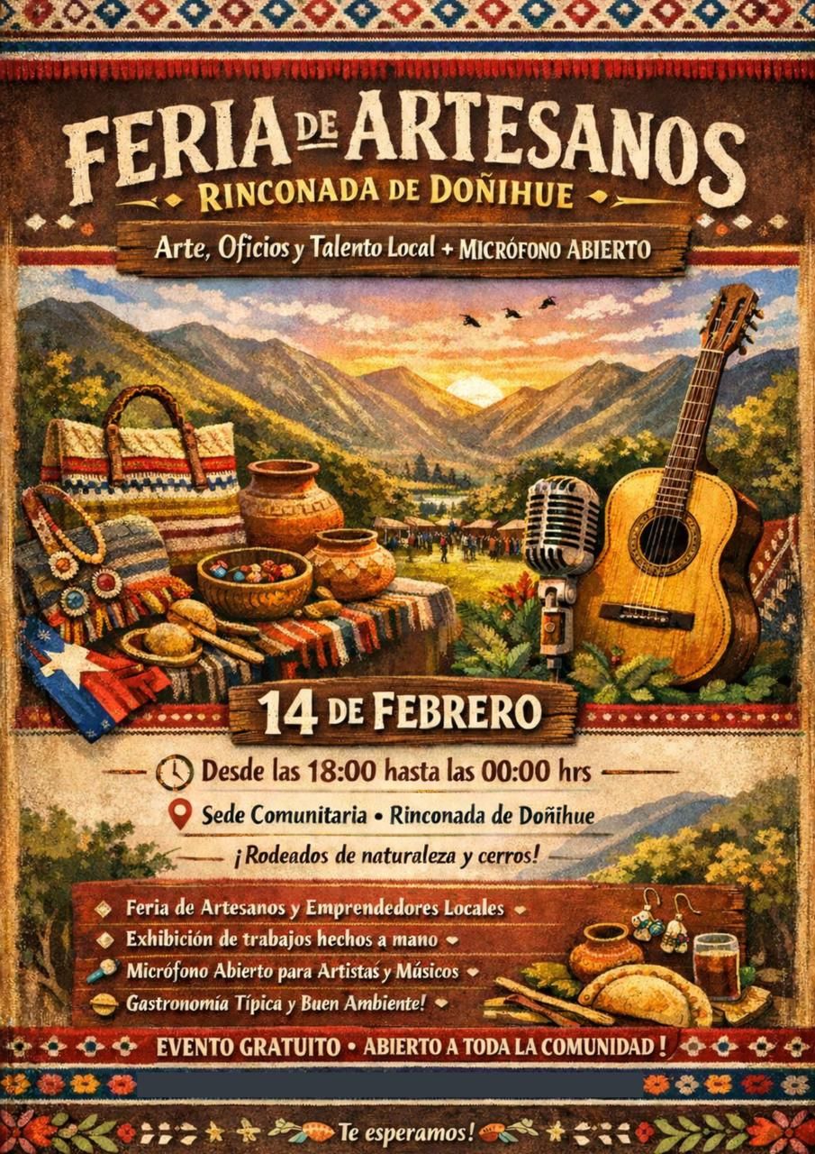 Arte, tradición y música serán protagonistas este sábado 14 de febrero en la localidad de Rinconada de Doñihue, donde se realizará por primera vez la Feria de Artesanos, una instancia que busca destacar el talento local y generar un espacio de encuentro familiar en un entorno natural característico de la comuna.