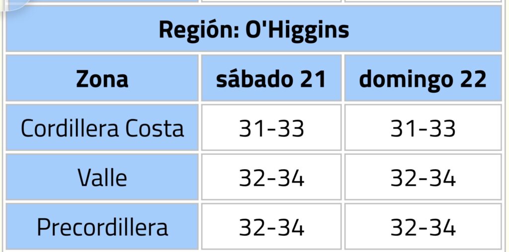 La Dirección Meteorológica de Chile, emitió un ‘aviso meteorológico’ vigente desde la tarde del próximo sábado 21 de febrero hasta el dominngo 22 del mismo mes, por altas temperaturas que afectarán a varias regiones, entre ellas O’Higgins.
