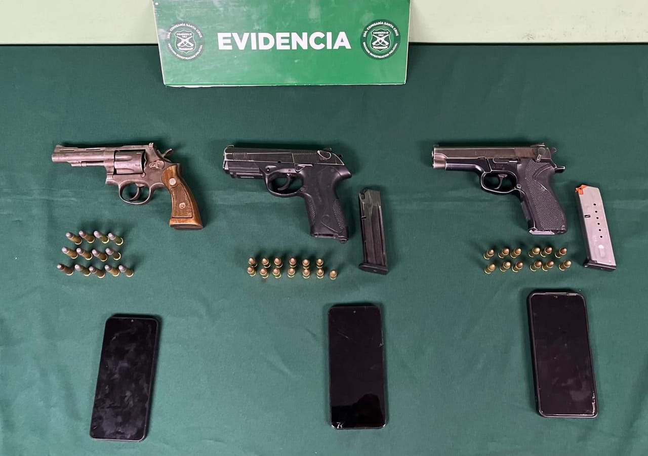 Asimismo, Carabineros incautó tres teléfonos celulares y un total de tres armas de fuego: dos pistolas y un revólver. Estas se encontraban cargadas, con 25 cartuchos calibre 9 milímetros y 13 calibre .38, todos sin percutir.