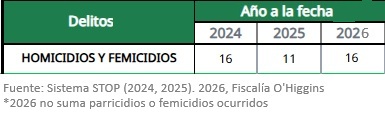 La Región de O’Higgins consigna 16 homicidios en lo que va corrido de 2026, una estadística mayor a la del año pasado a la misma fecha, e igual a la registrada en 2024.