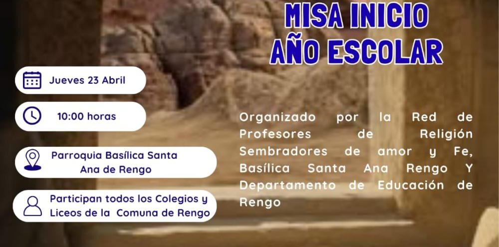 La comunidad educativa de Rengo se reunirá el próximo jueves 23 de abril, a las 10:00 horas, para participar en una misa de inicio de año escolar en la Parroquia Basílica Santa Ana.